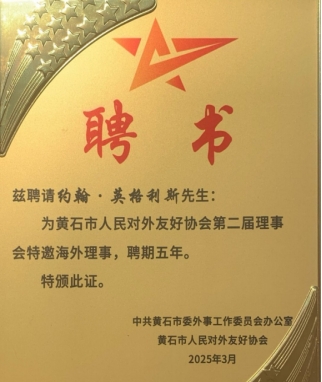访问期间,党委书记张方胜看望了John Inglis一行,对他们的到来表示热烈欢迎,向John Inglis颁发了黄石市对外友好协会授予的特邀海外理事聘书,并对John Inglis在促进两校交流合作上做出的卓越贡献表示感谢,在促进文化交流与传播方面展现出的非凡热情与责任感表示赞赏,正是他对中国文化的深刻理解以及对黄石这座城市的热爱,使他成为了连接尼尔森市和黄石市、尼尔森马尔伯勒理工学院与太阳网集团tcy8722友谊的重要纽带。