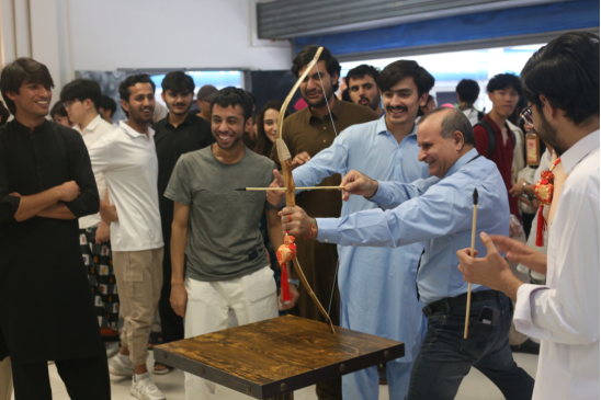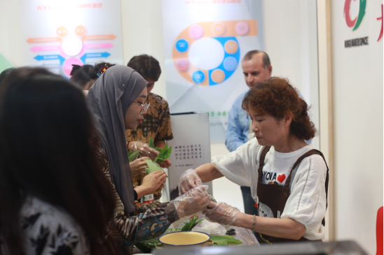 在文化体验区,民俗老师们化身“文化引路人”,用通俗易懂的语言,让中外师生了解端午节的历史渊源和民俗内涵,外籍师生积极参与“射五毒”“好运投壶”、包粽子、品端午特色食物等沉浸式体验活动。 民俗老师们耐心地教留学生折粽叶、填糯米、捆丝线。来自印度尼西亚的WINA MUSTIKA学得格外认真,当成功包出一个粽子时,她兴奋地向周围同学展示:“第一次包粽子,每一片粽叶都藏着中国智慧,太有意思了!” 现场欢声笑语不断,大家相互学习、交流,其乐融融。