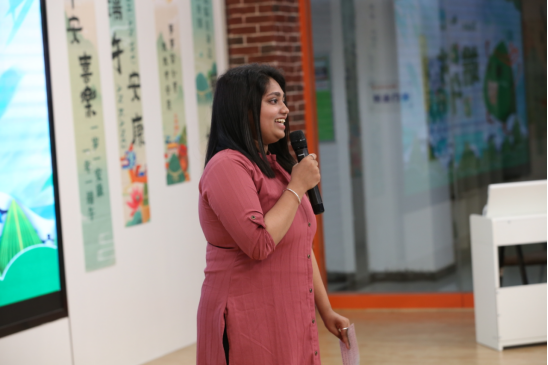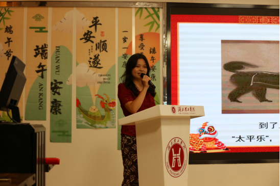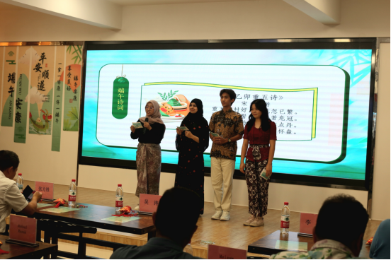 在文化展示环节,来自印度、印度尼西亚的留学生POOJARI SUJANA和ERRANDO TAMPATI向中外师生讲解了端午节的由来、文化习俗和爱国诗人屈原的故事。印度尼西亚留学生ACKITA VHIONICA、WULAN OKA WIJAYA分享了汉语桥故事会《留学生眼中的中医》《舞狮》节目。来自巴基斯坦、印度尼西亚留学生DILAN TONGLO TIKUPADANG、SIDDIQUE MISBAH、ANIQA MUKHTIAR、ILYAS MARYAM、MUHAMMAD JOFAR TEGUH、VERRA VYOLA等朗诵了端午诗词《乙卯重五诗》《和端午》。