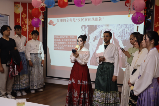 红灯笼、玉兔灯与中秋主题对联相映成趣,活动现场节日氛围浓郁。在“华裳体验”环节,2025级临床医学专业留学生们兴致勃勃地换上汉服,讲解汉服的历史,指导同学们学习行礼姿态。来自爱尔兰的留学生SAIFULLAH SANAULLAH(崔俊明)整理着衣袖,兴奋地说:“穿上这身衣服,好像瞬间走进了中国古诗里的场景”。在“甜蜜滋味”美食体验环节,2024级临床医学专业留学生们介绍了中秋节的起源、传说和传统习俗。在大家品月饼、桂花蜜的同时,留学生们介绍了月饼、桂花蜜的种类、文化寓意。在“匠心工巧”环节,2023级临床医学专业留学生们讲解了漆扇的历史、工艺特点和艺术价值,还带领大家体验漆扇制作。活动现场还穿插了中秋文化知识竞答,现场气氛热烈欢快。